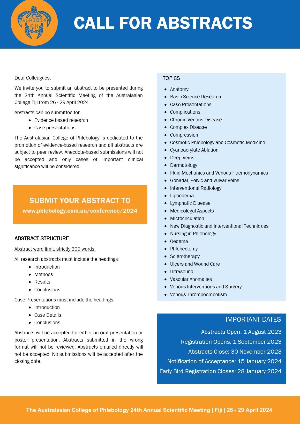 The Australasian College of Phlebology is dedicated to the promotion of evidence-based research and all abstracts are subject to peer review. Anecdote-based submissions will not be accepted and only cases of important clinical significance will be considered. ABSTRACT SUBMISSION CLOSES 30 NOVEMBER 2023.